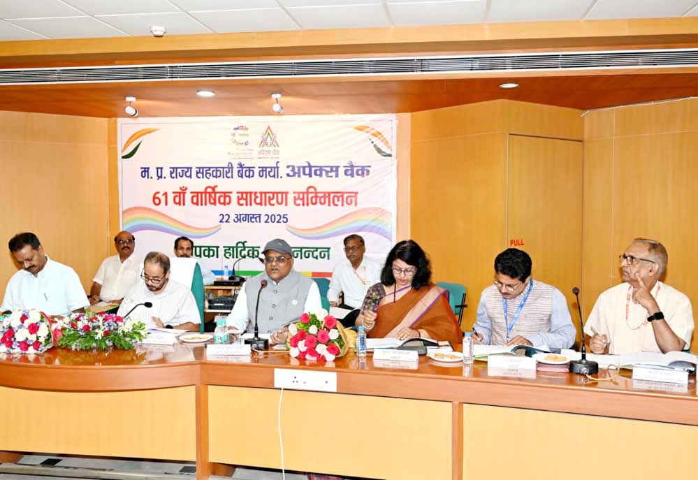 अपेक्स बैंक की 61 वीं वार्षिक साधारण सभा आज अपेक्स बैंक में समन्वय भवन के सभागार में म.प्र.शासन के प्रमुख सचिव, सहकारिता एवं अपेक्स बैंक के प्रशासक श्री डी.पी.आहूजा की अध्यक्षता में आयोजित हुई । बैठक के आरंभ में अपेक्स बैंक के प्रबंध संचालक श्री मनोज गुप्ता ने बैंक के प्रशासक श्री डी.पी.आहूजा, आयुक्त सहकारिता एवं पंजीयक श्री मनोज पुष्प एवं बैंक के पूर्व प्रबंध संचालक श्री प्रदीप नीखरा का पुष्प-गुच्छ से स्वागत किया ।