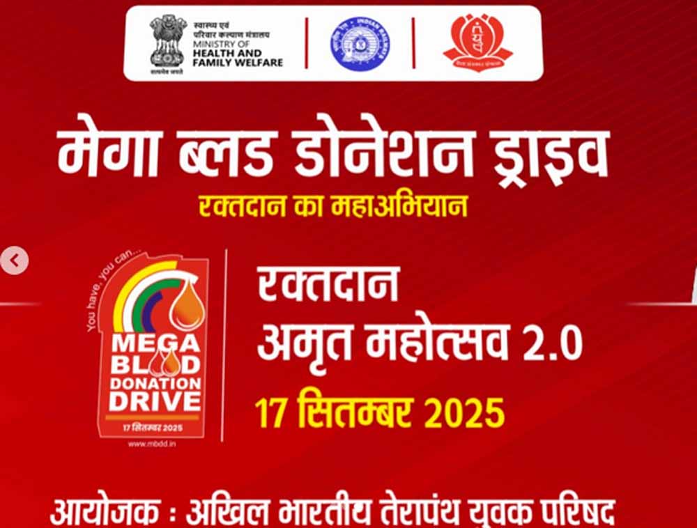 अखिल भारतीय तेरापंथ युवक परिषद की ओर से 17 सितंबर को विश्वव्यापी मेगा रक्तदान शिविर का आयोजन किया जाएगा। देशभर के शहरों के साथ 50 से ज्यादा देशों में 7500 से अधिक शिविर आयोजित किए जाएंगे। रक्तदान अमृत महोत्सव 2.0 के तहत छत्तीसगढ़ के सभी जिलों में भी रक्तदान शिविर आयोजित होंगे, जिसमें बड़ी संख्या में लोग रक्तदान करेंगे।