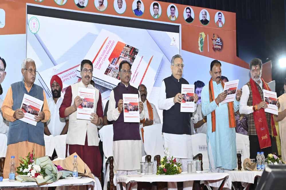 मुख्यमंत्री विष्णु देव साय आज राजधानी रायपुर के पंडित जवाहरलाल नेहरू स्मृति चिकित्सा महाविद्यालय के सभागार में छत्तीसगढ़ मेडिकल सर्विस कॉर्पोरेशन लिमिटेड (सीजीएमएससी) के नव नियुक्त अध्यक्ष दीपक म्हस्के के पदभार ग्रहण कार्यक्रम में शामिल हुए और मुख्य अतिथि की आसंदी से उन्हें शुभकामनाएं दी। इस दौरान मुख्यमंत्री सहित अतिथियों ने सीजीएमएससी सप्लाई चैन मैनेजमेंट एसओपी का विमोचन किया।