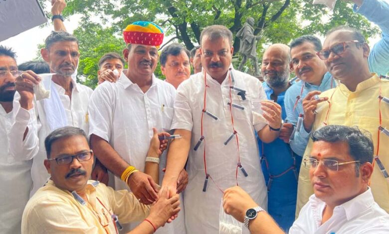 कांग्रेस विधायकों ने इंजेक्शन और नकली ड्रग्स की सामग्री लेकर विरोध प्रदर्शन किया
