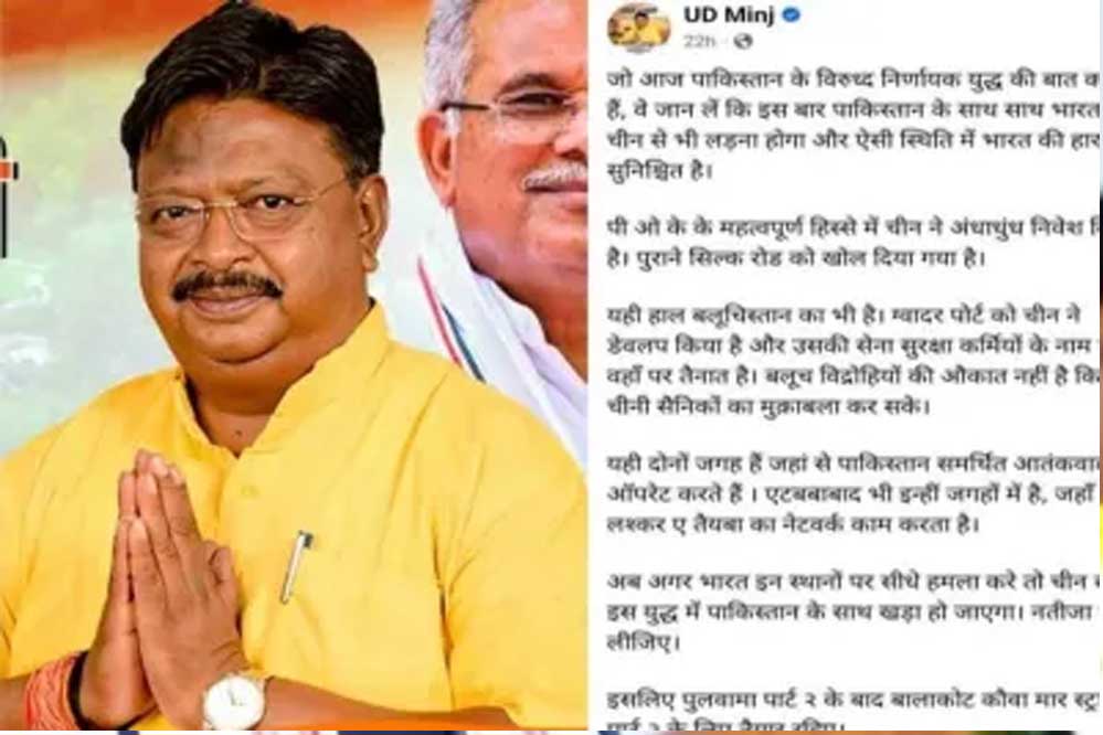 पहलगाम आतंकी हमले के बाद पाकिस्तान को करारा जवाब देने की मांग उठ रही है। इसी बीच कांग्रेस के एक सीनियर नेता ने ऐसा पोस्ट किया है जिसके बाद सियासी हलचलें तेज हो गई हैं। कुनकरी विधानसभा सीट से पूर्व विधायक रहे यूडी मिंज ने अपने सोशल मीडिया में भारत और सेना के खिलाफ विवादित पोस्ट किया है। उन्होंने लिखा है कि अगर पाकिस्तान से भारत युद्ध करता है तो उसकी हार निश्चित है। विधायक की सोशल मीडिया पोस्ट पर तेजी से वायरल हो रही है।