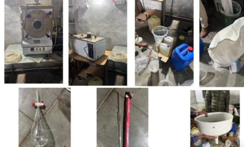 छापेमारी के बाद एक व्यक्ति को स्वापक औषधि और मन: प्रभावी पदार्थ अधिनियम (एनडीपीएस) के तहत गिरफ्तार किया गया है। प्रयोगशाला सुदूर एक ऐसे स्थान पर स्थापित की गई थी, जहां पहुंचने के लिए कोई सड़क सुविधा नहीं थी। अधिकारी पैदल ही वहां पहुंचे और संतरे के बगीचे में एक ढांचा देखा।
