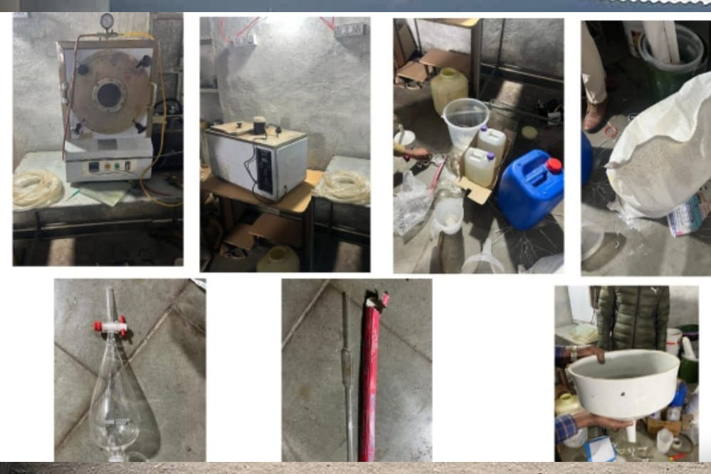 टीम ने 80.96 किलोग्राम और 7.5 लीटर रसायन बरामद किया, जिसमें एसीटोन, टोल्यूनि, हाइड्रोक्लोरिक एसिड, सोडियम सल्फेट, सोडियम कार्बोनेट, सल्फ्यूरिक एसिड, ब्रोमीन जल, इथेनॉल आदि शामिल थे।