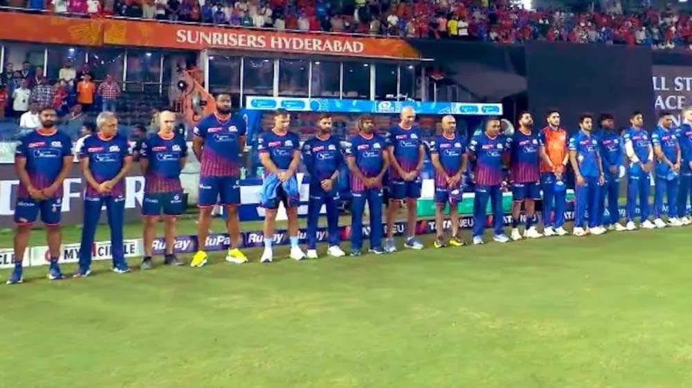 इंडियन प्रीमियर लीग (IPL) में आज मुंबई इंडियंस और सनराइजर्स हैदराबाद की टक्कर हो रही है. लेकिन इस मैच में खिलाड़ी और अंपायर काली पट्टी पहनकर मैदान में उतरे हैं. दरअसल, पहलगाम में हुए आतंकी हमले के बाद ये फैसला लिया गया है.  ये बदलाव पहलगाम में मारे गए लोगों को श्रद्धांजलि देने के लिए किया गया है. इस मैच में टॉस जीतकर हार्दिक पंड्या ने पहले गेंदबाजी का फैसला लिया है.