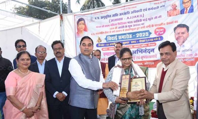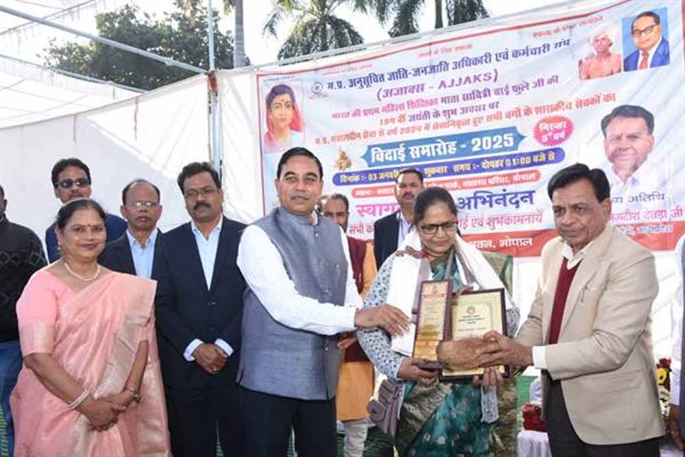 सरदार वल्लभ भाई पटेल पार्क, मंत्रालय परिसर, भोपाल में मप्र अनुसूचित जाति-जनजाति अधिकारी एवं कर्मचारी संघ (अजाक्स) की ओर से भारत की प्रथम महिला शिक्षिका माता सावित्रीबाई फुले की 194वीं जयंती के अवसर पर म.प्र. मंत्रालयीन सेवा से वर्ष 2024 में सेवानिवृत्त हुए सभी वर्गों के लगभग 84 शासकीय सेवकों के विदाई समारोह का आयोजन किया गया।
