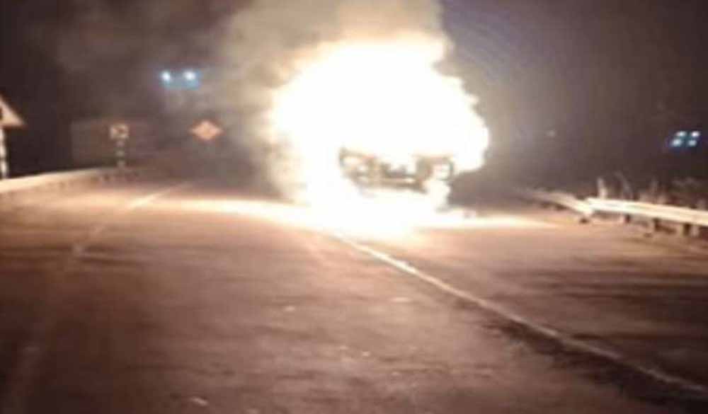 ट्रक और बाइक में जबरदस्त भिड़ंत, दोनों वाहनों में लगी भीषण आग