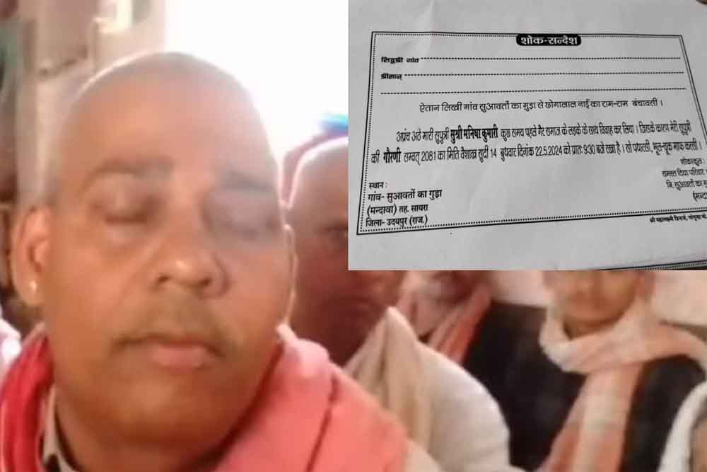 राजस्थान के उदयपुर में एक पिता ने जिंदा बेटी की तेरहवीं कर दी। उसने मुंडन करवाया और शोक पत्रिका छपवाकर लोगों को मृत्यु भोज के लिए आमंत्रित किया। पिता ने ऐसा इसलिए किया क्योंकि उसकी बेटी ने गैर जाति के लड़के से कोर्ट मैरिज कर ली थी। लेकिन, हैरानी की बात यह है कि जब बेटी माता के सामने पहुंची तो उसने पहचानने से इनकार कर दिया। इससे आहत पिता ने यह कदम उठाया।