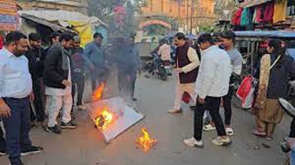 सपा संरक्षक की प्रतिमा मामले में समाजवादी युवजन सभा के कार्यकर्ताओं ने महंत राजू दास का पुतला फूंका