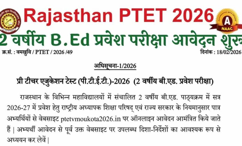 राजस्थान में कोटा के वर्धमान महावीर खुला विश्वविद्यालय की ओर से आयोजित पीटीईटी- 2026 परीक्षा के लिए गुरुवार से ptetvmoukota2026.in पर ऑनलाइन आवेदन प्रारंभ किये जा चुके हैं । आवेदन की अंतिम तिथि 30 मार्च है। प्रवेश परीक्षा 14 जून 2026 को होगी। आपको बता दें कि पीटीईटी से दो वर्षीय बीएड और 4 वर्षीय इन्टीग्रेटेड बीए बीएड एवं बीएससी बीएड कोर्स में दाखिला मिलता था। लेकिन एनसीटीई की गाइडलाइन के बाद 4 वर्षीय इन्टीग्रेटेड बीए बीएड एवं बीएससी बीएड कोर्स बंद कर दिया गया है और दाखिले रोक दिए गए हैं।