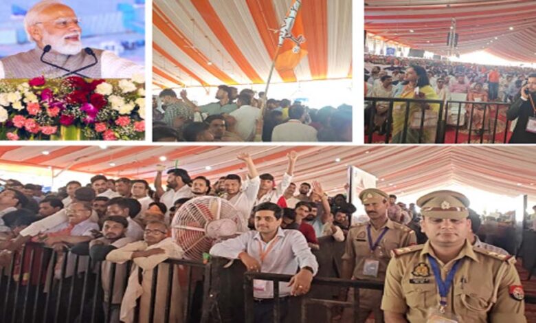 जैसे ही पीएम मोदी के साथ सीएम योगी मंच पर पहुंचे, पूरा परिसर अपार जनसमूह की तालियों और नारों से गुंजायमान हो उठा। युवाओं व महिलाओं के हाथों में प्रधानमंत्री मोदी और मुख्यमंत्री योगी आदित्यनाथ की तस्वीरों वाले पोस्टर लहरा रहे थे। भारी संख्या में लोग राष्ट्रीय ध्वज लेकर भी पहुंचे थे। पीएम और सीएम की तस्वीरों के कटआउट जनसभा को जीवंत बना रहे थे। प्रधानमंत्री मोदी के आह्वान पर पंडाल में हजारों मोबाइल फोन की फ्लैश लाइट मानो उत्तर प्रदेश के चमकते भविष्य की झलक दिखा रही थी।