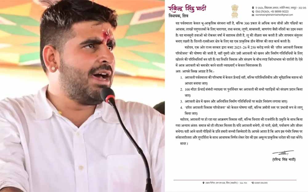 विधायक भाटी ने यह भी रेखांकित किया कि अरावली केवल भू-आकृतिक संरचना नहीं है, बल्कि यह 300 से अधिक वन्य जीवों और पक्षियों का आवास है। यह लाखों पशुपालकों के लिए चारागाह, बनास, लूणी, साबरमती और बाणगंगा जैसी नदियों का उद्गम स्थल भी है। साथ ही अरावली मानसूनी हवाओं को रोकने, लू की तीव्रता कम करने और तापमान संतुलन बनाए रखने में अहम भूमिका निभाती है। दिल्ली-एनसीआर क्षेत्र के लिए इसे प्राकृतिक ग्रीन बैरियर बताया गया है।