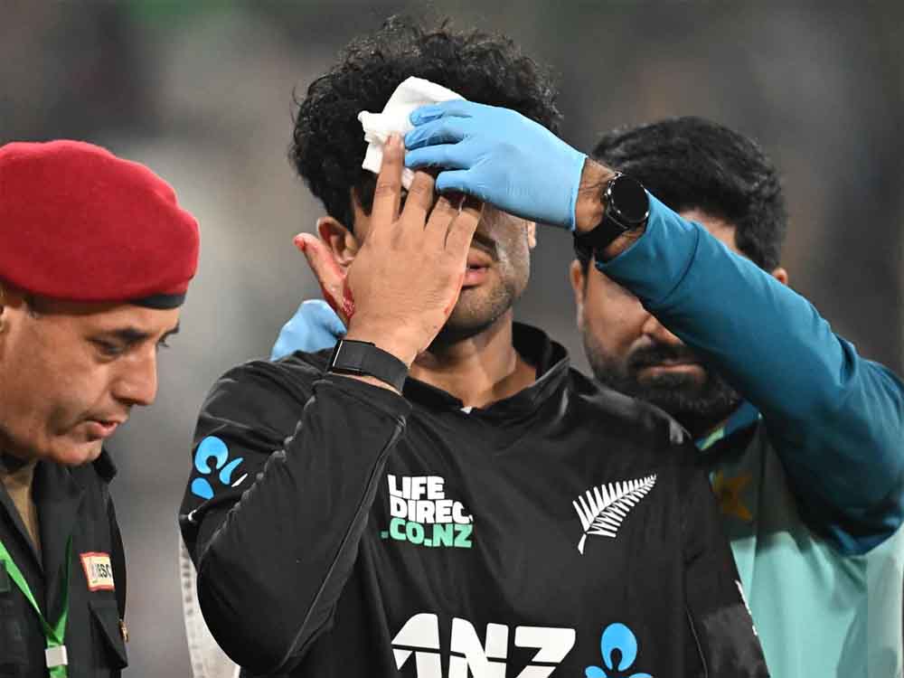त्रिकोणीय क्रिकेट सीरीज का पहला मैच पाक और न्यूजीलैंड के बीच गद्दाफी क्रिकेट स्टेडियम में खेला गया, लेकिन इस मैच में कीवी टीम के रविंद्र बुरी तरह से चोटिल हो गए। सोशल मीडिया पर यह दावा किया जा रहा है कि रचिन को यह चोट खराब फ्लड लाइट्स के कारण लगी, जिसकी वजह से वह कैच को सही तरह से देख नहीं पाए और गेंद उनके आंख के बिल्कुल पास में आकर लगी। गेंद लगते ही खून निकलने लगा और उनका चेहरा लहूलुहान हो गया। इसके बाद फौरन उन्हें मैदान से बाहर लेकर जाया गया। इस मैच में न्यूजीलैंड क्रिकेट टीम ने पाक को उसी की धरती पर 78 रनों से हरा दिया। मैच में न्यूजीलैंड ने टॉस जीतकर पहले बल्लेबाजी करते हुए कीवी टीम ने ग्लेन फिलिप्स के पहले एकदिवसीय शतक से 50 ओवर में 6 विकेट पर 330 रन बनाये। इसके बाद लक्ष्य का पीछा करते हुए मेजबान पाकिस्तान की टीम फखर जमान के 84 रनों सहायता से 47.5 ओवर में 252 रन ही बना पाई।