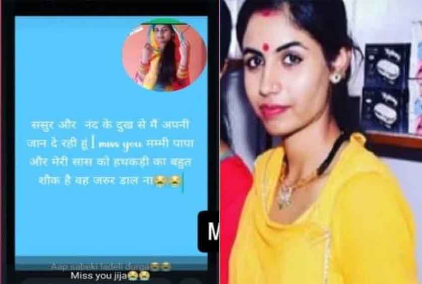 मेरी सास को हथकड़ी लगाने का बहुत शौक है, आप इसे जरूर पूरा करना।" यह संदेश पढ़कर परिवार और परिचितों में हड़कंप मच गया। मृतका के पिता देवीसिंह ने हदां थाने में दहेज उत्पीड़न का मामला दर्ज कराया है। रिपोर्ट के अनुसार दुर्गा की शादी 2021 में दिलीप सिंह से हुई थी। शादी के बाद से ही मृतका के ससुर छैलूसिंह, सास कमा कंवर और ननद सोनू कंवर दहेज की मांग को लेकर दुर्गा को प्रताड़ित कर रहे थे। दुर्गा के भाई सांगू सिंह ने बताया कि उनकी बहन को लगातार मानसिक और शारीरिक उत्पीड़न का सामना करना पड़ रहा था। घटना वाले दिन दुर्गा ने स्टेटस लगाया और इसके बाद कुंड में कूदकर अपनी जान दे दी। थानाधिकारी हदां ओमप्रकाश सुथार ने बताया कि मृतका के पिता की शिकायत पर मामला दर्ज कर लिया गया है और मामले की जांच शुरू कर दी है। मृतका के भाई का कहना है कि मरने से पहले उसने अपने सोशल मीडिया पर स्टेटस लगाया कि "मिस यू मम्मी-पापा" मेरी सास को हथकड़ी लगाने का बहुत शौक है। आप उसकी ये हसरत पूरी करना। स्टेटस को देखकर जब हमने ससुराल वालों से पता किया तो पता चला कि दुर्गा की पानी के कुंड में डूबने से मौत हो गई है। मृतका के परिजनों ने दोषियों के खिलाफ सख्त से सख्त कार्रवाई करने की मांग की है। पुलिस ने शव को पोस्टमार्टम के लिए भेज दिया है और मामले की जांच जारी है।