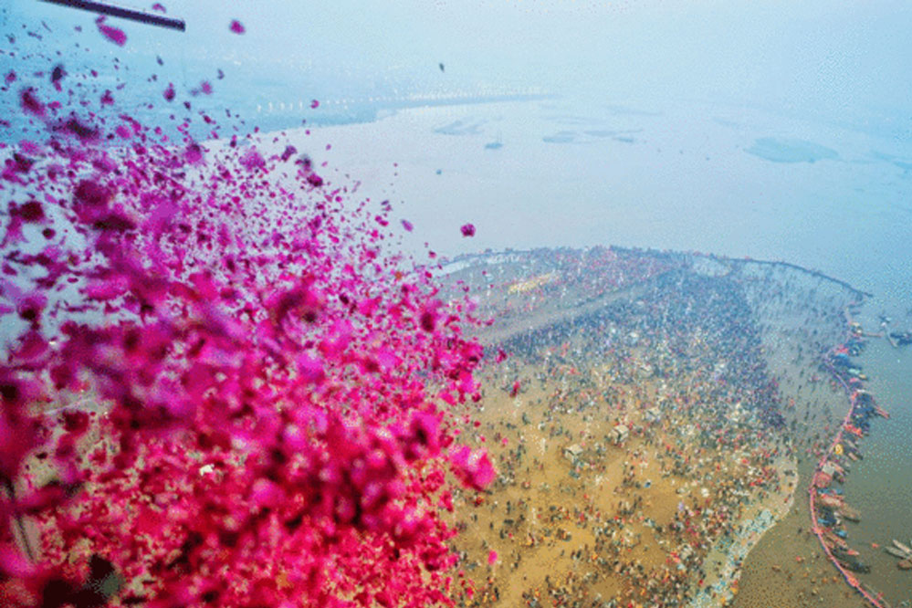 सभी घाटों और अखाड़ों पर हेलीकॉप्टर से हुई पुष्पवर्षा