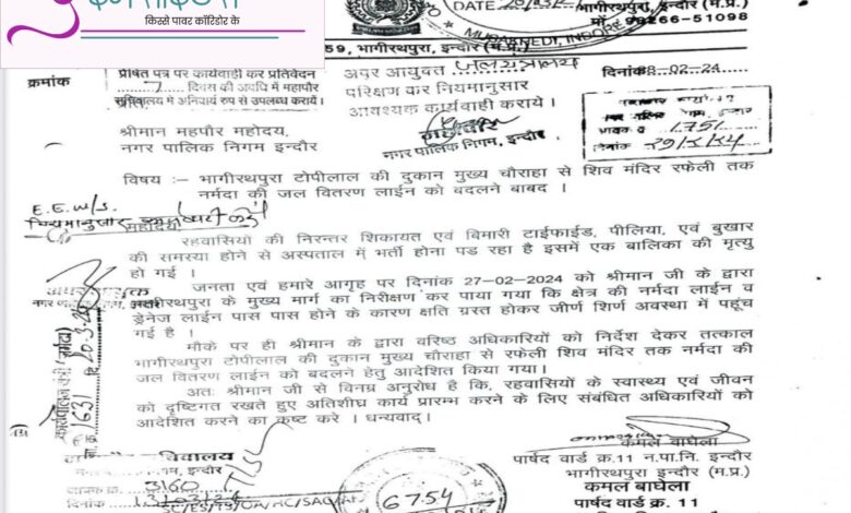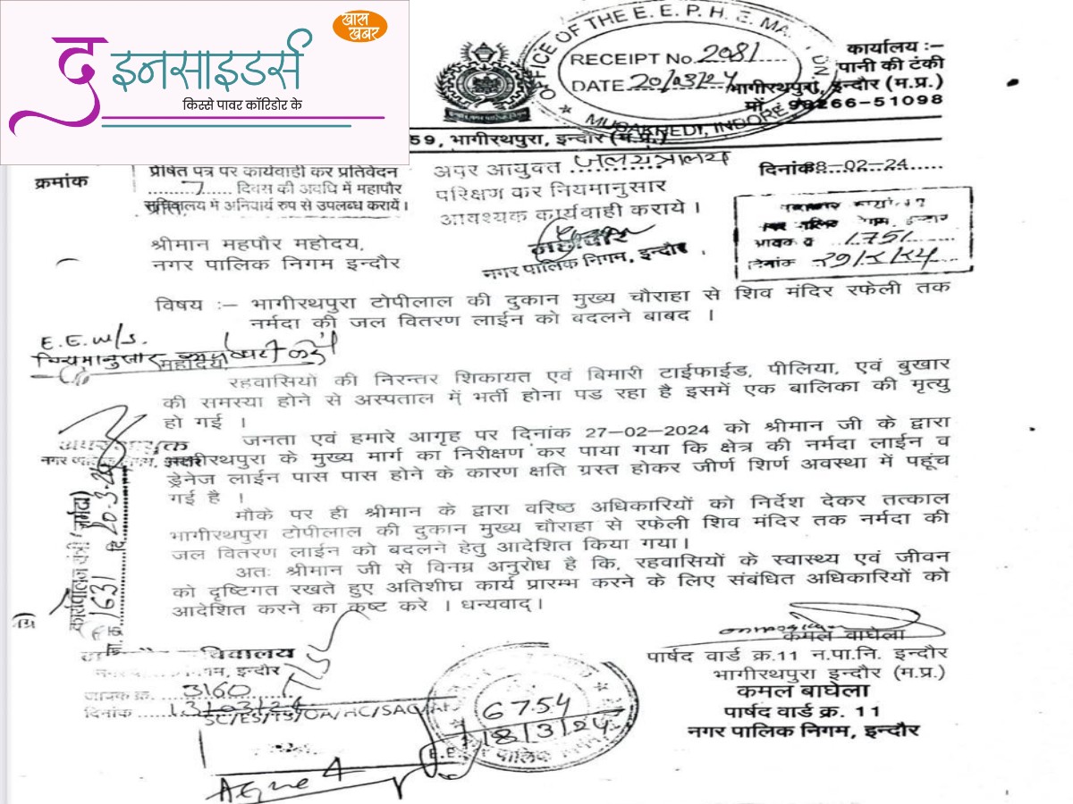 ‘द इनसाइडर्स’ को मिले एक दस्तावेज में भाजपा पार्षद कमल बाघेला की एक चिट्ठी भी मिली है, जो उन्होंने 8 फरवरी 2024 को महापौर पुष्यमित्र भार्गव को लिखी थी। इस पत्र में स्पष्ट उल्लेख था कि क्षेत्र में गंदे पानी की निरंतर सप्लाई से लोग टाइफाइड, पीलिया और बुखार की चपेट में आ रहे हैं और एक बालिका की मृत्यु भी हो चुकी है। महापौर ने यह पत्र तत्काल कार्रवाई हेतु तत्कालीन अपर आयुक्त अभिलाष मिश्रा को मार्क किया था, जिसका जवाब उन्हें 7 दिनों के भीतर देना था। मिश्रा इसके बाद लगभग डेढ़ साल तक निगम में पदस्थ रहे, लेकिन पाइपलाइन नहीं बदली गई।