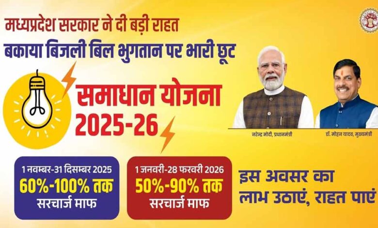 समाधान योजना 2025-26 का उद्देश्य 3 माह से अधिक अवधि के उपभोक्ताओं को बकाया विलंबित भुगतान के सरचार्ज पर छूट प्रदान करना है। यह योजना जल्दी आएं, एकमुश्‍त भुगतान कर ज्यादा लाभ पाएं के सिद्धांत पर आधारित है। योजना में द्वितीय और अंतिम चरण 01 फरवरी से शुरू हो चुका है जो कि 28 फरवरी 2026 तक चलेगा। दूसरे चरण में एक मुश्‍त भुगतान करने पर 70 से 90 फीसदी तथा किस्‍तों में भुगतान करने पर 50 से 60 फ़ीसदी तक सरचार्ज माफ किया जा रहा है। समाधान योजना 2025-26 का लाभ उठाने के लिए उपभोक्ताओं को म.प्र. मध्‍य क्षेत्र विद्युत वितरण कंपनी भोपाल के लिये portal.mpcz.in पर पंजीयन कराना होगा।