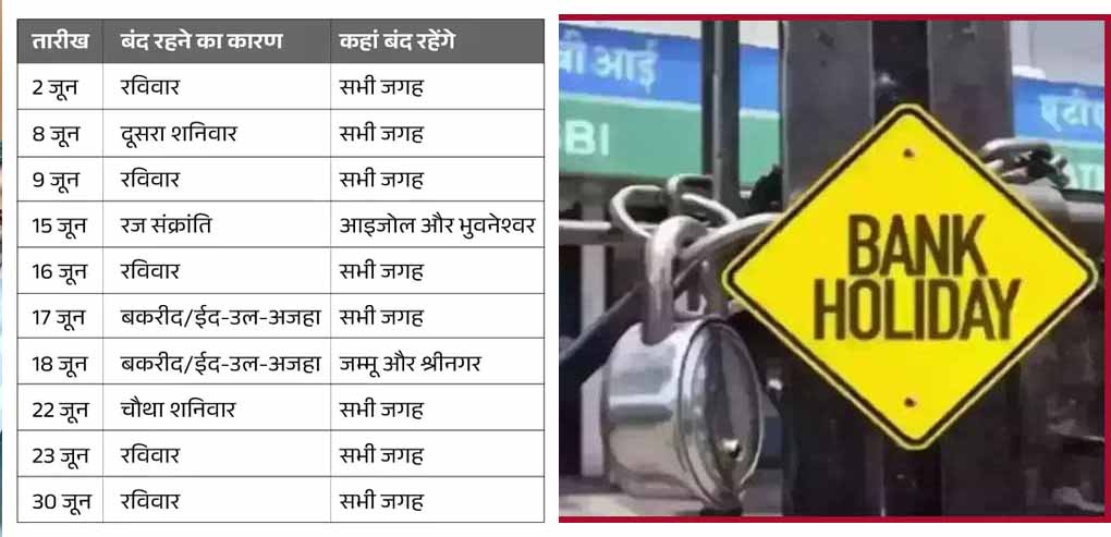 अगर आपका बैंक से संबंधित कोई जरूरी काम है तो उसे अगले सप्ताह फटाफट निपटा लें। मई का महीना अब खत्म होने जा रहा है। इसके बाद जून के महीने की शुरुआत हो जाएगी। बैंकों में जून में कई दिन छुट्टियां रहने वाली हैं। ऐसे में आपके जरूरी काम अटक सकते हैं। आपको परेशान होना पड़ सकता है। यहां हम आपको बैंकों में छुट्टियों की पूरी लिस्ट देने जा रहे हैं, जिससे आपको किसी तरह की कोई समस्या न हो। हर हफ्ते के रविवार को और महीने के दूसरे व चौथे शनिवार को बैंकों की छुट्टी रहती है। अगले महीने यानी जून में बैंकों में कुल 10 दिन छुट्टी रहने वाली है। 17 जून को बकरीद/ईद-उल-अजहा के मौके पर देशभर में बैंक बंद रहेंगे। वहीं 18 जून को भी जम्मू और श्रीनगर में बैंकों में कामकाज नहीं होगा। ऐसे में आप अभी से बैंक संबंधित अपने जरूरी काम फटाफट निपटा लीजिए। जिससे आपको किसी तरह की समस्या का कोई सामना न करना पड़े।