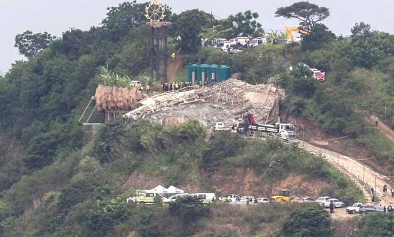 दक्षिण अफ्रीका के एक भारतीय कस्बे में स्थित रेडक्लिफ पहाड़ी पर बने एक चार मंजिला मंदिर के निर्माणाधीन हिस्से के गिरने से कई लोगों की मौत हो गई है। अहोबिलम मंदिर के नाम से स्थानीय लोगों के बीच लोकप्रिय इस मंदिर में शुक्रवार को हुए हादसे के बाद से लगातार बचाव अभियान जारी है। अभी तक चार शवों को बरामद किया गया है। स्थानीय प्रशासन के मुताबिक बचावकर्मियों को एक और शव का पता चला है, लेकिन खराब मौसम की वजह से बचाव कार्य बंद करना पड़ गया। अभी भी कई टन मलबे के नीचे कितने लोग और दबे हुए हैं इसको लेकर अलग-अलग दावे किए जा रहे हैं।