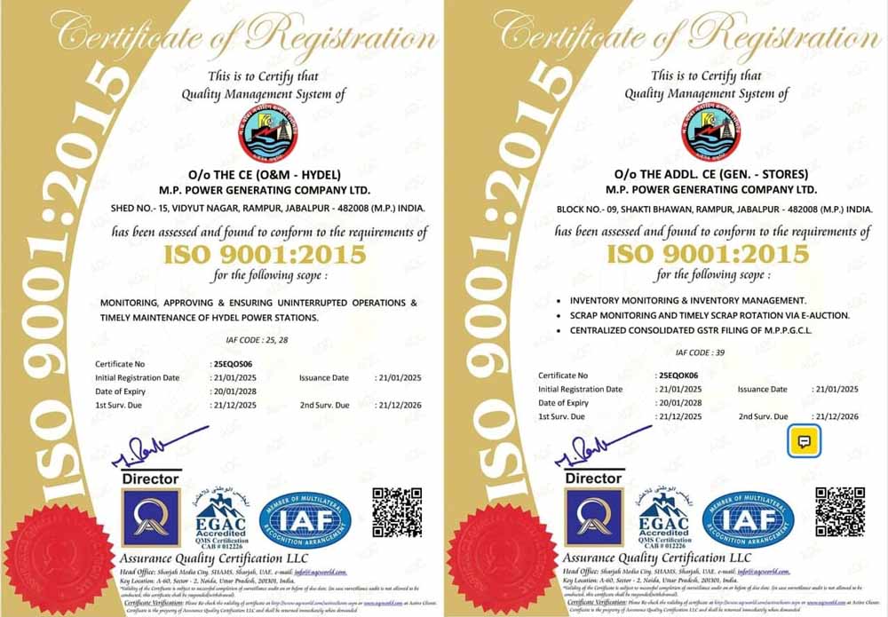 मध्यप्रदेश पॉवर जनरेटिंग कंपनी के मुख्यालय जबलपुर के दो कार्यालयों मुख्य अभियंता उत्पादन भंडार और मुख्य अभियंता संचालन संधारण-जल विद्युत को उत्कृष्ट मानदंडों का पालन करने के लिए अंतर्राष्ट्रीय क्वालिटी मैनेजमेंट सिस्टम 9001:2015 सर्ट‍िफिकेशन प्राप्त हुआ है। मध्यप्रदेश पॉवर जनरेटिंग कंपनी के दो कार्यालयों को आईएसओ सर्ट‍िफिकेशन होने पर ऊर्जा मंत्री श्री प्रद्युम्न सिंह तोमर ने कार्यालयों के समस्त अभियंताओं और कार्मिकों को शुभकामना और बधाई दी। उन्होंने अपेक्षा व्यक्त की कि ये कार्यालय भविष्य में भी इसी प्रकार उच्च स्तरीय क्वालिटी मानदंडों का पालन करते हुए कार्य करेंगे।